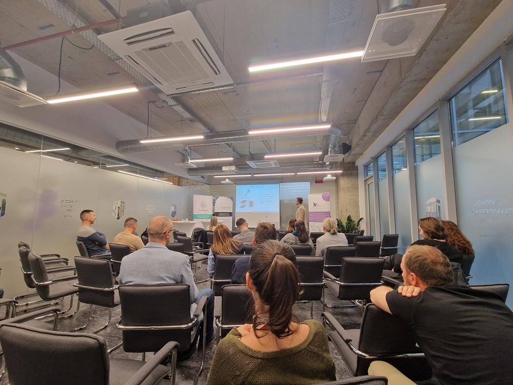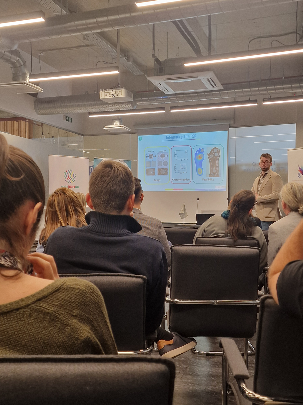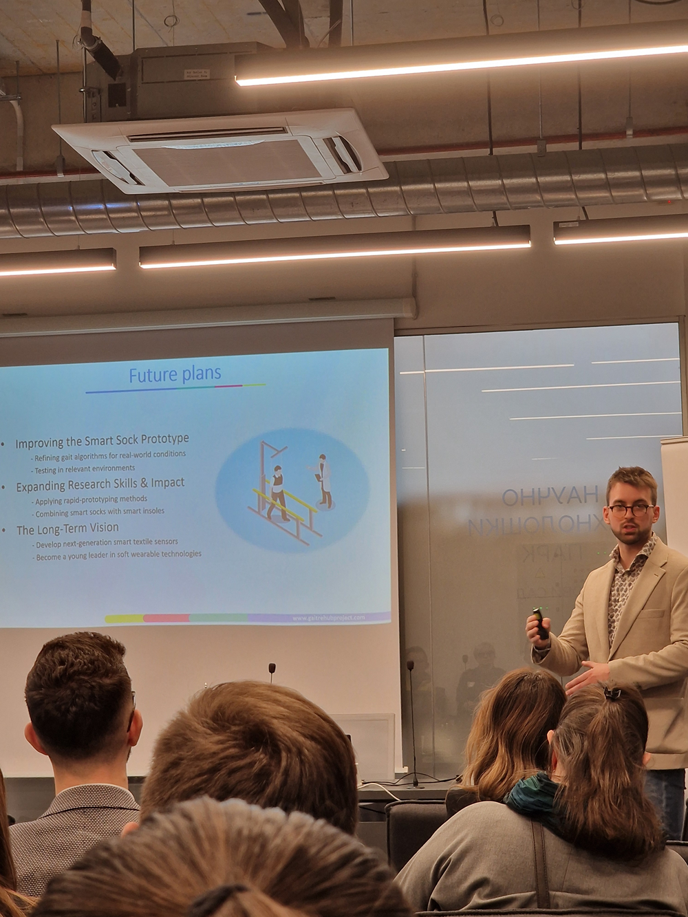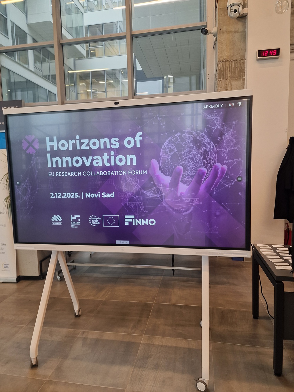 At the Horizons of Innovation – EU Research Collaboration Forum, the GAITREHUB project was featured through a dedicated presentation on smart insoles and smart socks for gait rehabilitation. Filip Mrkić from the Faculty of Technical Sciences presented the project, introducing its core focus on smart textiles, textile-based force-sensing resistors (FSR), smart socks, and pressure-sensing insoles designed to support advanced gait monitoring and rehabilitation.
